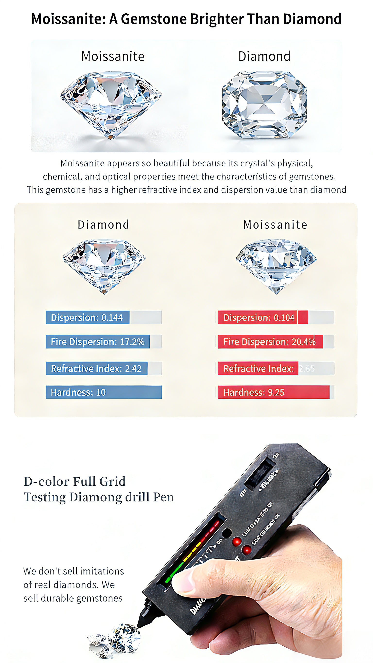 Moissanite appears so beautlful because its crystal's physical,chemical, and optical properties meet the charactenistics of gemstones.This gemstone has a higher refractive index and dispersion value than diamond.